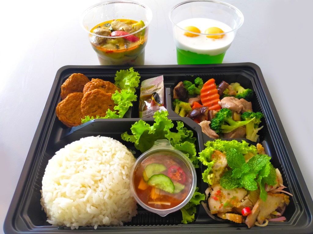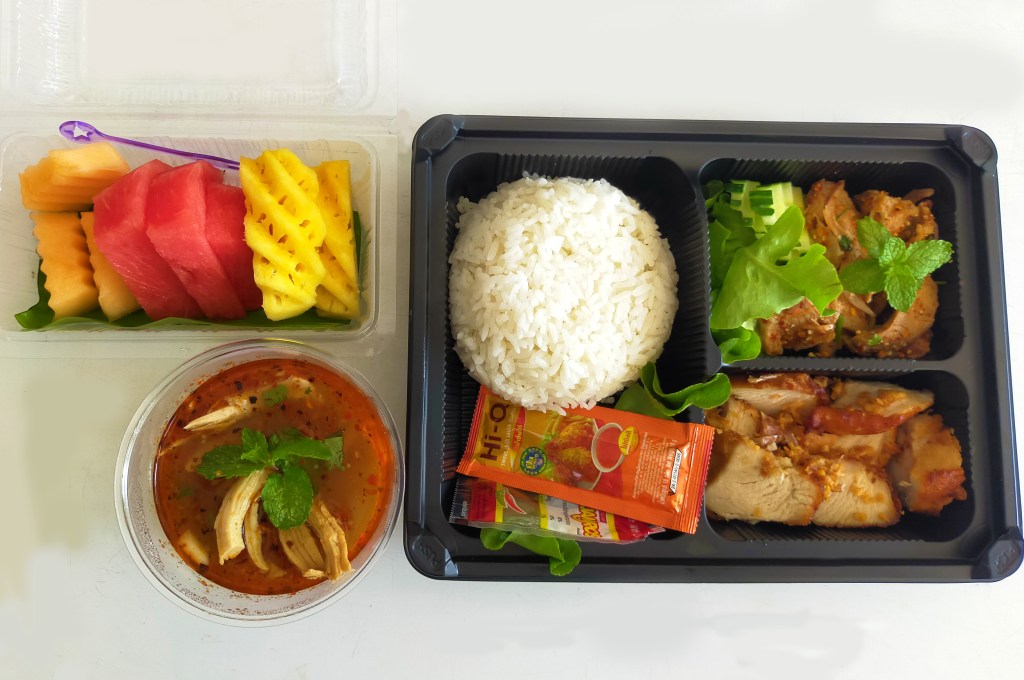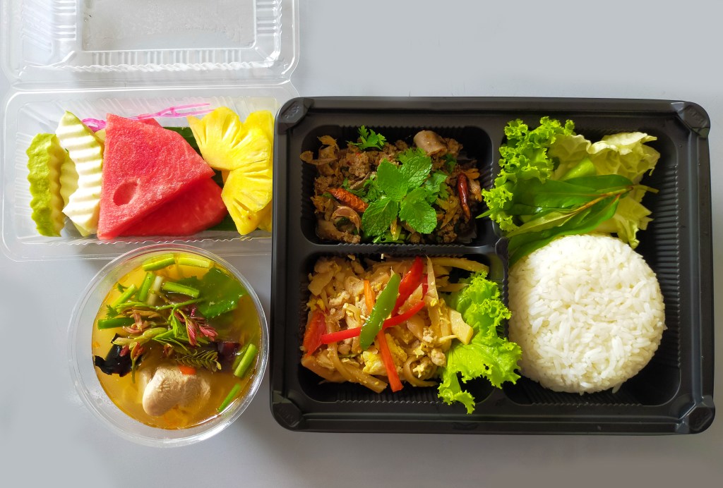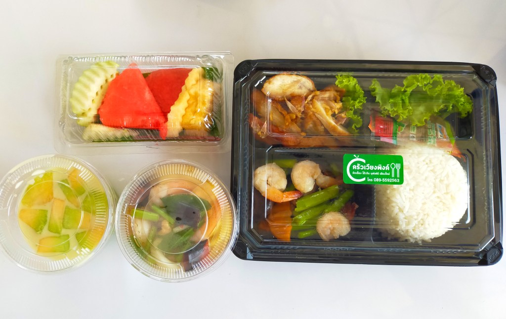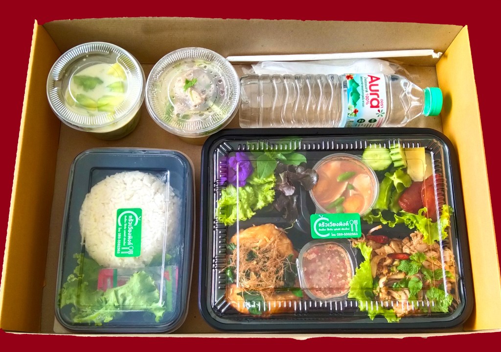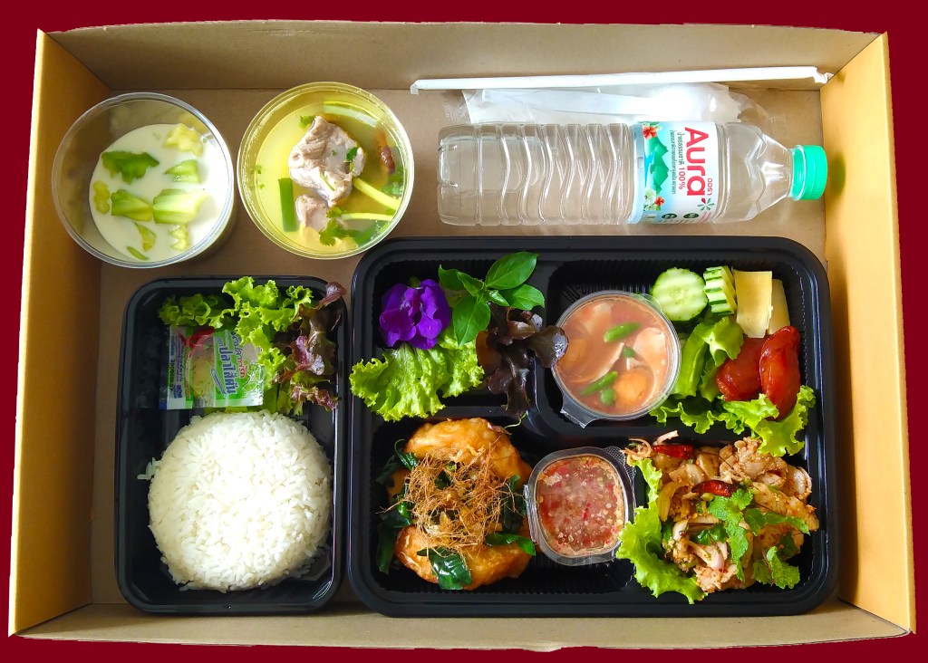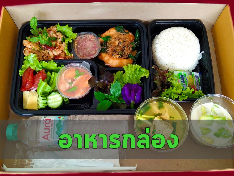 - กล่องลูกฟูกใหญ่ // 10 บาท อาหาร 4 อย่าง+ข้าว+ของหวาน + น้ำดื่มบรรจุขวด