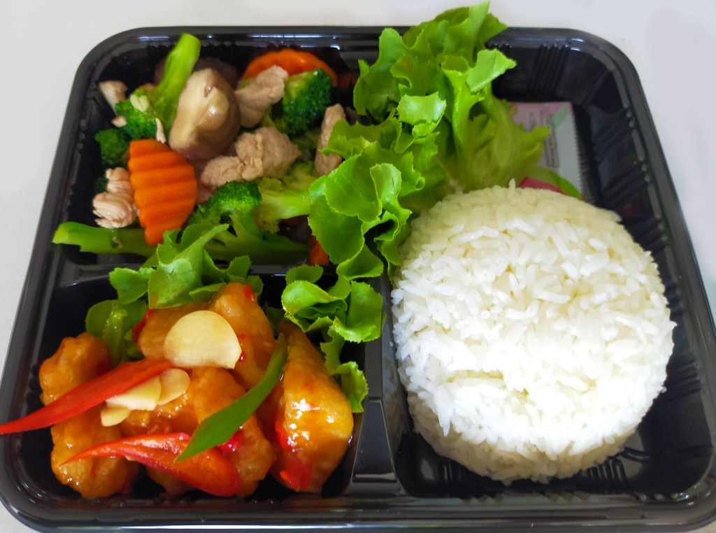 - กล่องลูกฟูกกลาง // 130 บาท อาหาร 3 อย่าง+ข้าว+ของหวาน